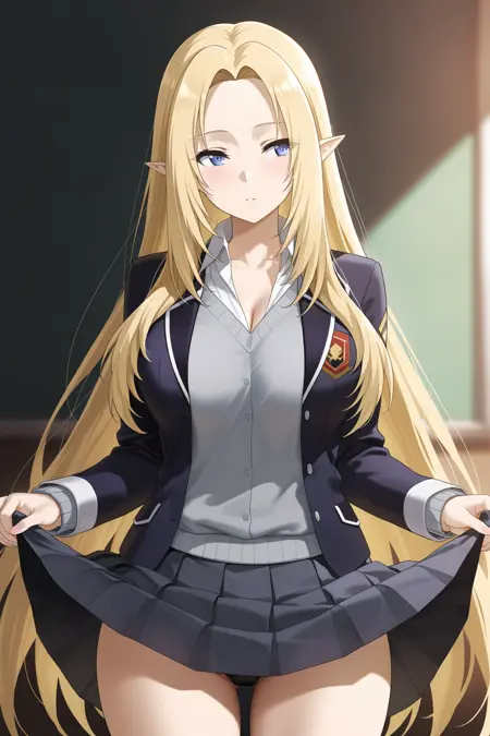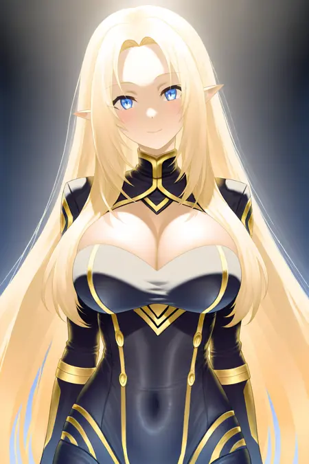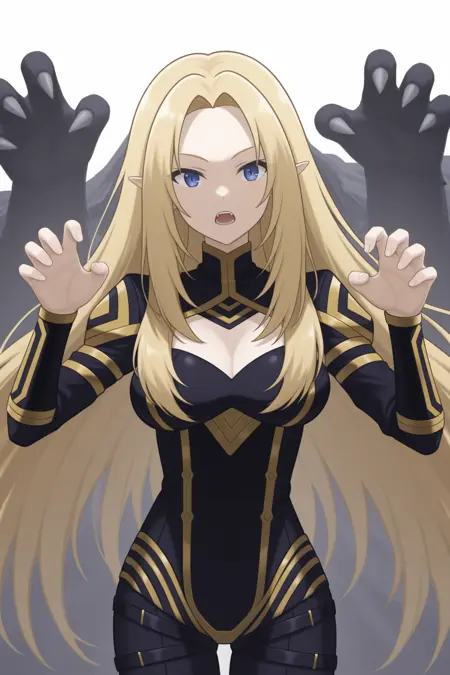 alpha \(kage no jitsuryokusha ni naritakute!\), 1girl, 뾰족한 귀, 혼자, 긴 머리, 바디수트, 엘프, 검은 바디수트, 가슴 부분 절개, 옷 절개, 배꼽 가림
