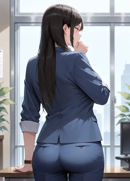 pantyh0e, 1girl, solo, 黒髪, 長髪, 黒目, 大きい胸, フォーマル, 事務員, ジャケット, 青いジャケット, 白いシャツ, ポロシャツ, 長袖, 袖をまくった, 腕時計, 黒いパンティストッキング, 白いパンツ, レースパンツ, パンティストッキングの下にパンツ, 黒い靴, 低めのブロックヒール