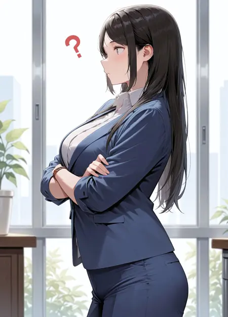 n0rk1sa, 1girl, solo, 黒髪, 長髪, 黒目, 大きい胸, フォーマル, 事務員, ジャケット, 青いジャケット, 白いシャツ, ポロシャツ, 長袖, 袖をまくった, 腕時計, 青いズボン, ベルト, 黒い靴, 低めのブロックヒール,