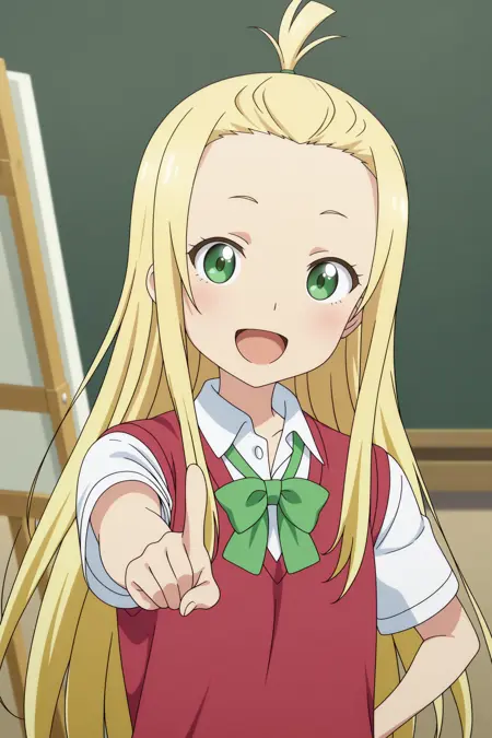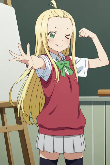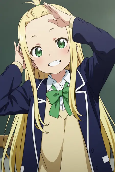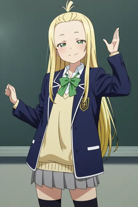 colette, 長い髪, 金髪, 前髪を後ろにピンで留め, 髪の結び目, 髪留め, 横髪, 緑色の目, 長袖, 青いジャケット, 開いたジャケット, 黄色いセーター, 白いシャツ, リボン付きシャツ, 緑色のネクタイ, 灰色のスカート, プリーツスカート, 黒い thighhighs, uwabaki