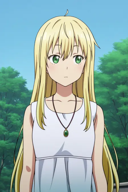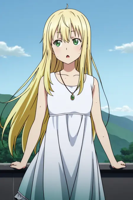 colette, 長い髪, 金髪, ahoge, ふわふわした前髪, 横髪, 緑色の目, ネックレス, 白いドレス, サイドレス, グラデーションドレス, レース縁取りのドレス, アンクルストラップ, 白い靴, フラットシューズ
