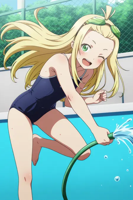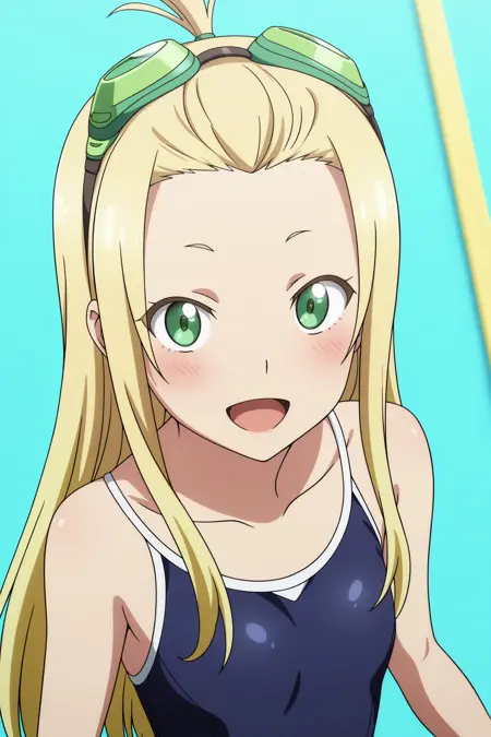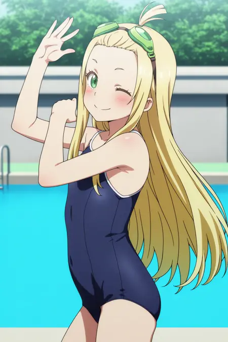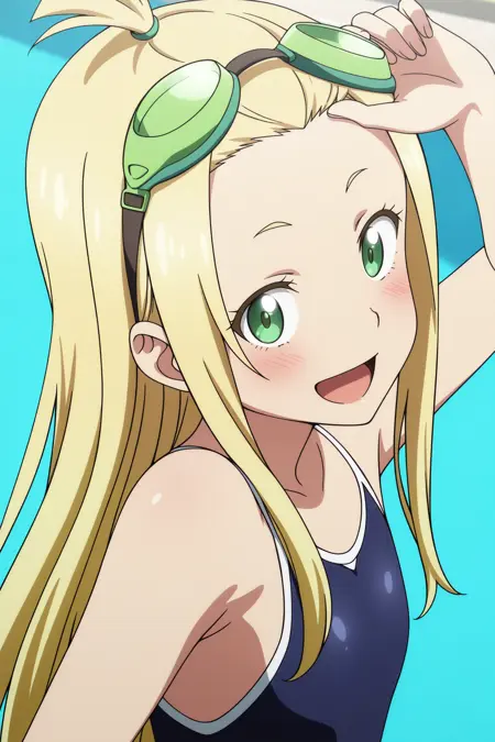 colette, 長い髪, 金髪, 前髪を後ろにピンで留め, 髪の結び目, 髪留め, 水泳用ゴーグル, ゴーグルを頭に, 横髪, 緑色の目, 学校水着, 青いワンピース水着