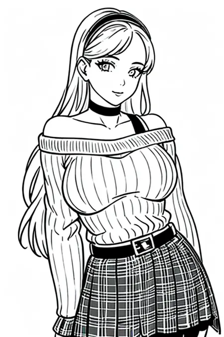 프롬프트: ((1girl)), 선예술, 단색, ((마스피스)), ((최고 품질)), ((8K 배경화면)), ((높은 디테일)), 머리띠, 치마, 초커, 긴 머리, 벨트, 머리 장식, 치마, 하트, 머리띠, 어깨 드리핑, 초커, collarbon, 빈 배경