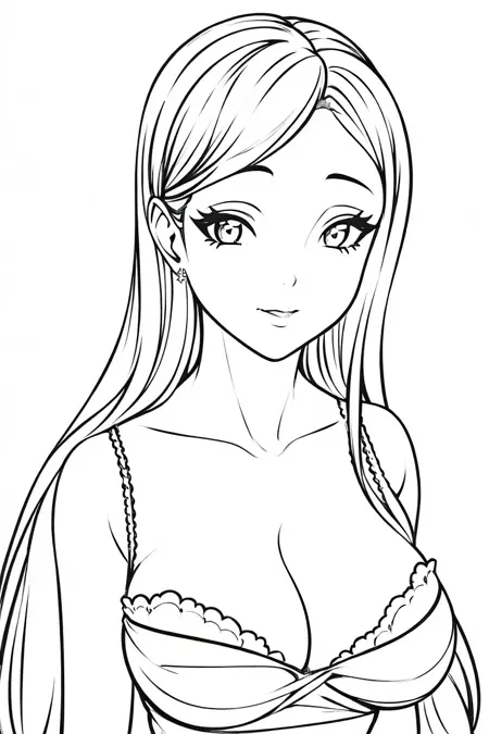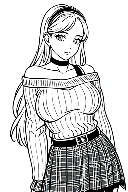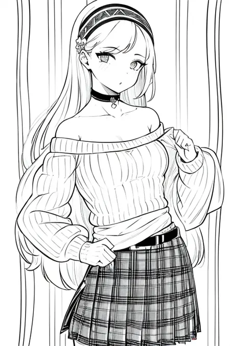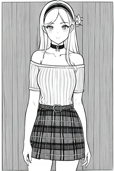 プロンプト:((1girl)),lineart, monochrome,((masterpiece)), ((best quality)),((8K wallpaper)),((highly detailed)), hairband, skirt, choker, long hair, belt, hair ornament, skirt, heart,hairband, off shoulder, choker, collarbon,blank background