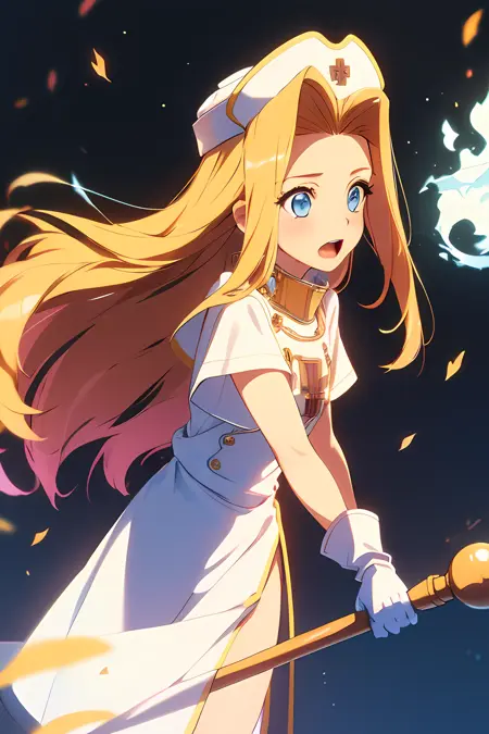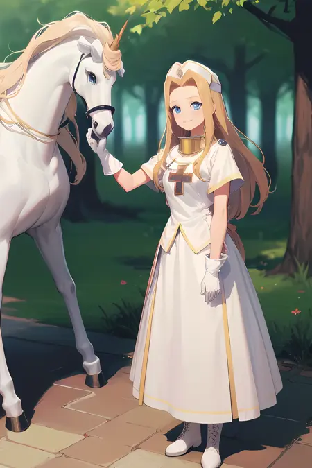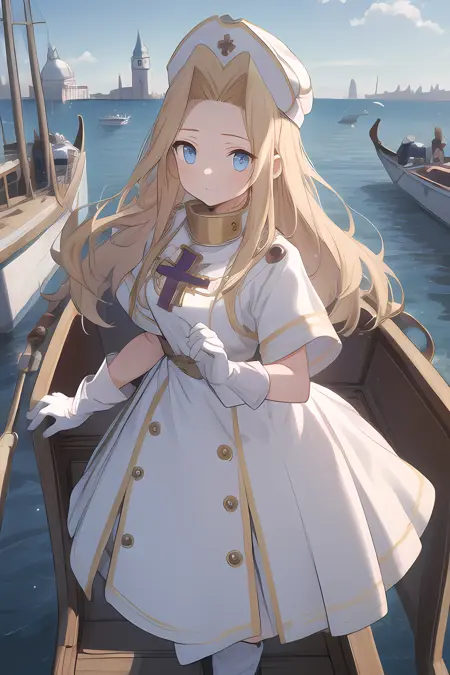 Recommended Prompts: hat, long hair, blonde hair,blue eyes, gloves,dress,cross,white boots,long skirt,