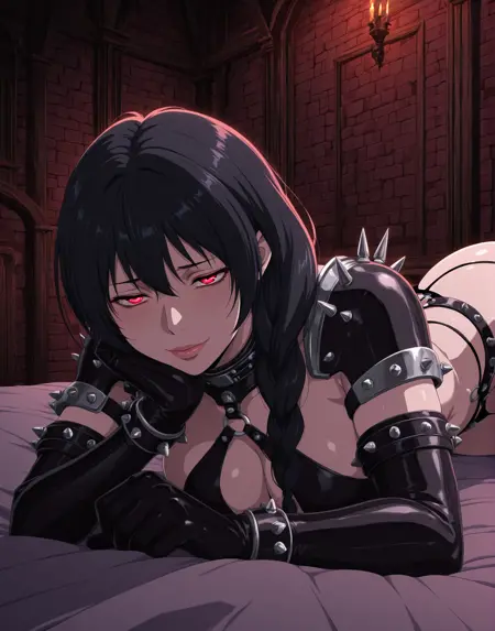 source_anime, anime coloring, 1girl, solo, black hair, red eyes, spikes, shoulder pads, armor, gloves, o-ring, lips, thong, midriff,