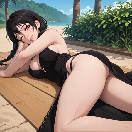 ChaSK, black hair, twintail, red eyes, braid, piercing, large breasts,