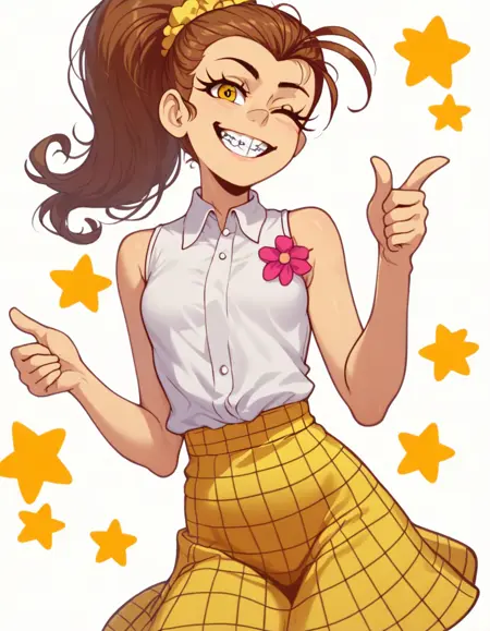 brown hair, ponytail, braces, buck teeth