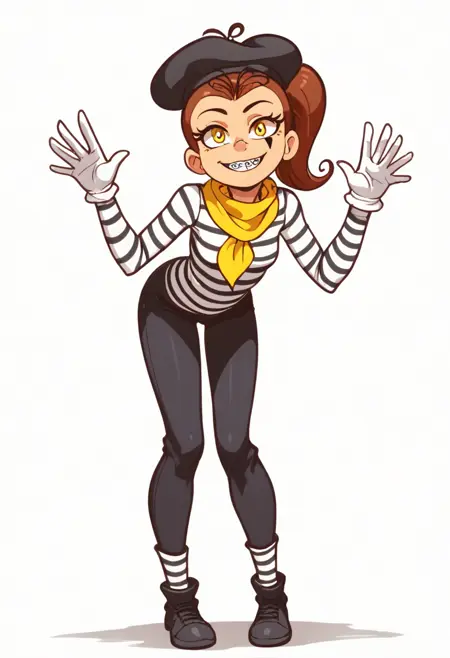 mime outfit: beret, facial mark, striped shirt, yellow neckerchief, black pants, black footwear