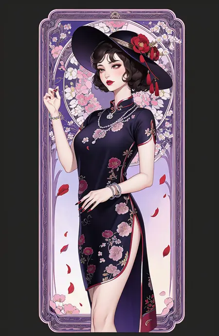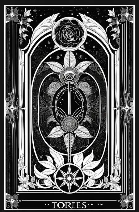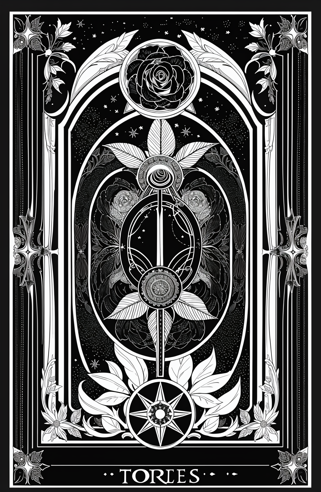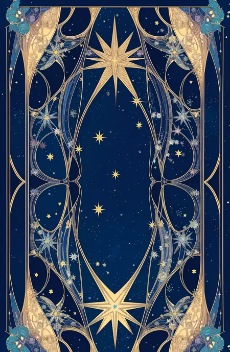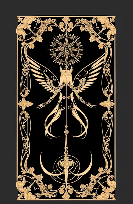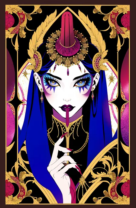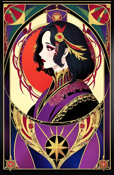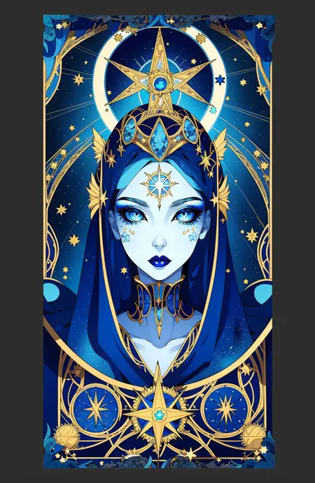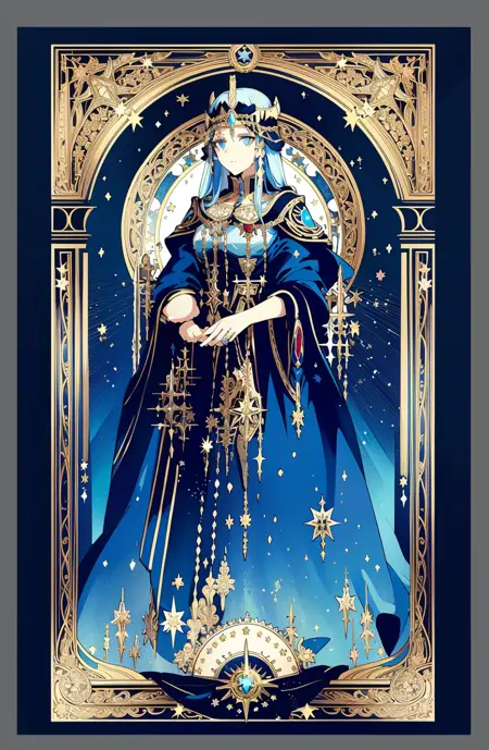 ヨーロッパ風キャラクターの例:コンセプトアート、タロットカード、縁取り、ヨーロッパ模様、タロットカード、独奏、星(シンボル)、1人の少女、青い唇、青い目、太陽シンボル、化粧、カード(中央)