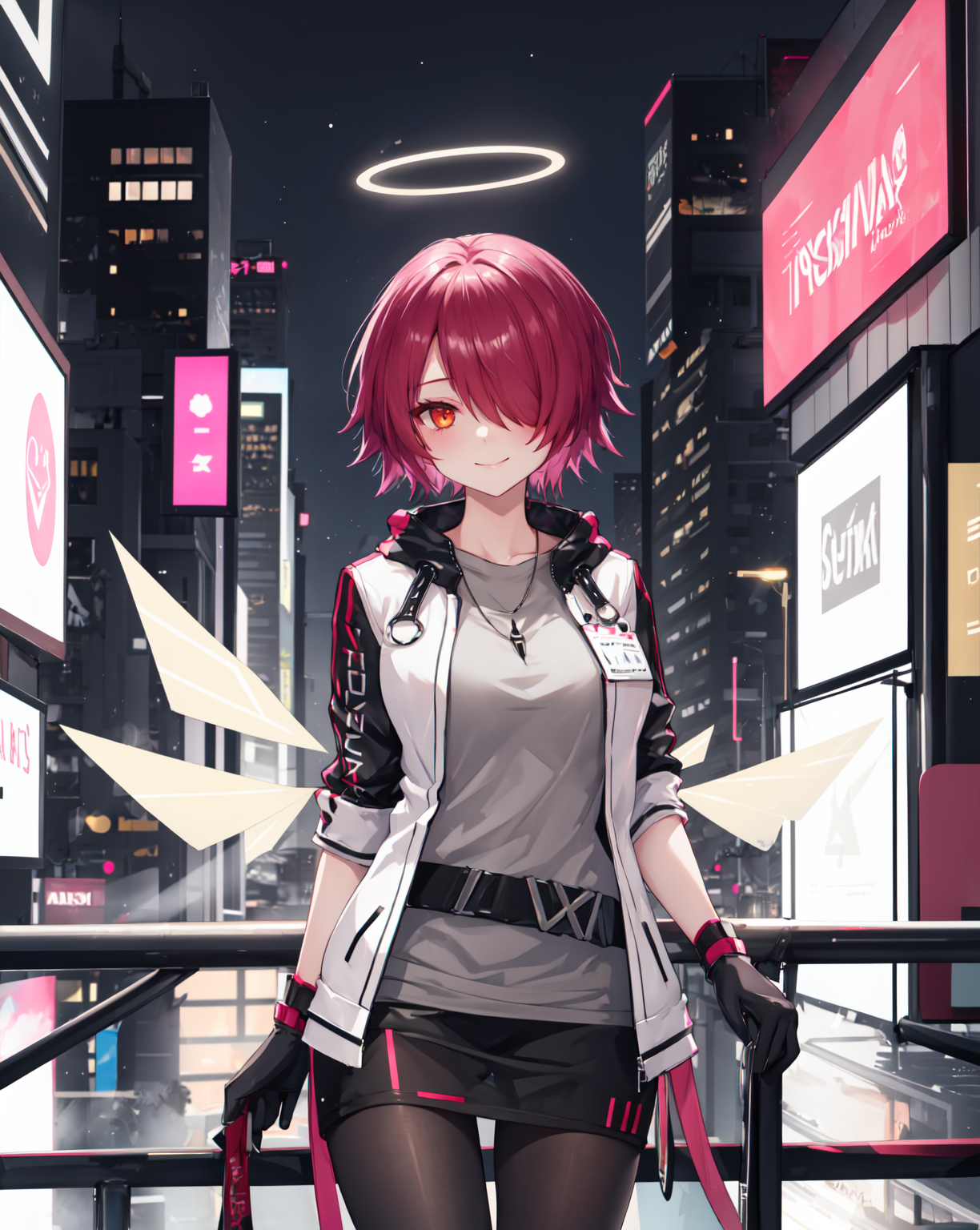 取り外し可能な翼、エネルギー翼、片目に髪をかけた、グレーのシャツ、ブラックの手袋、パンティーホース