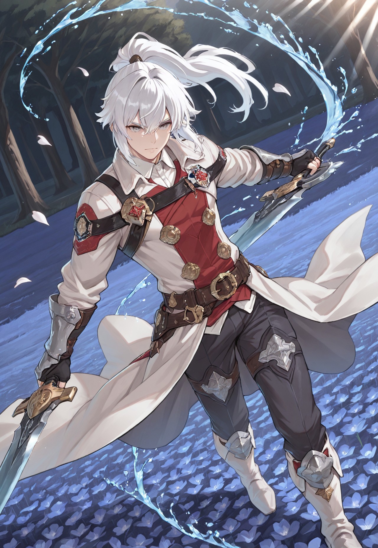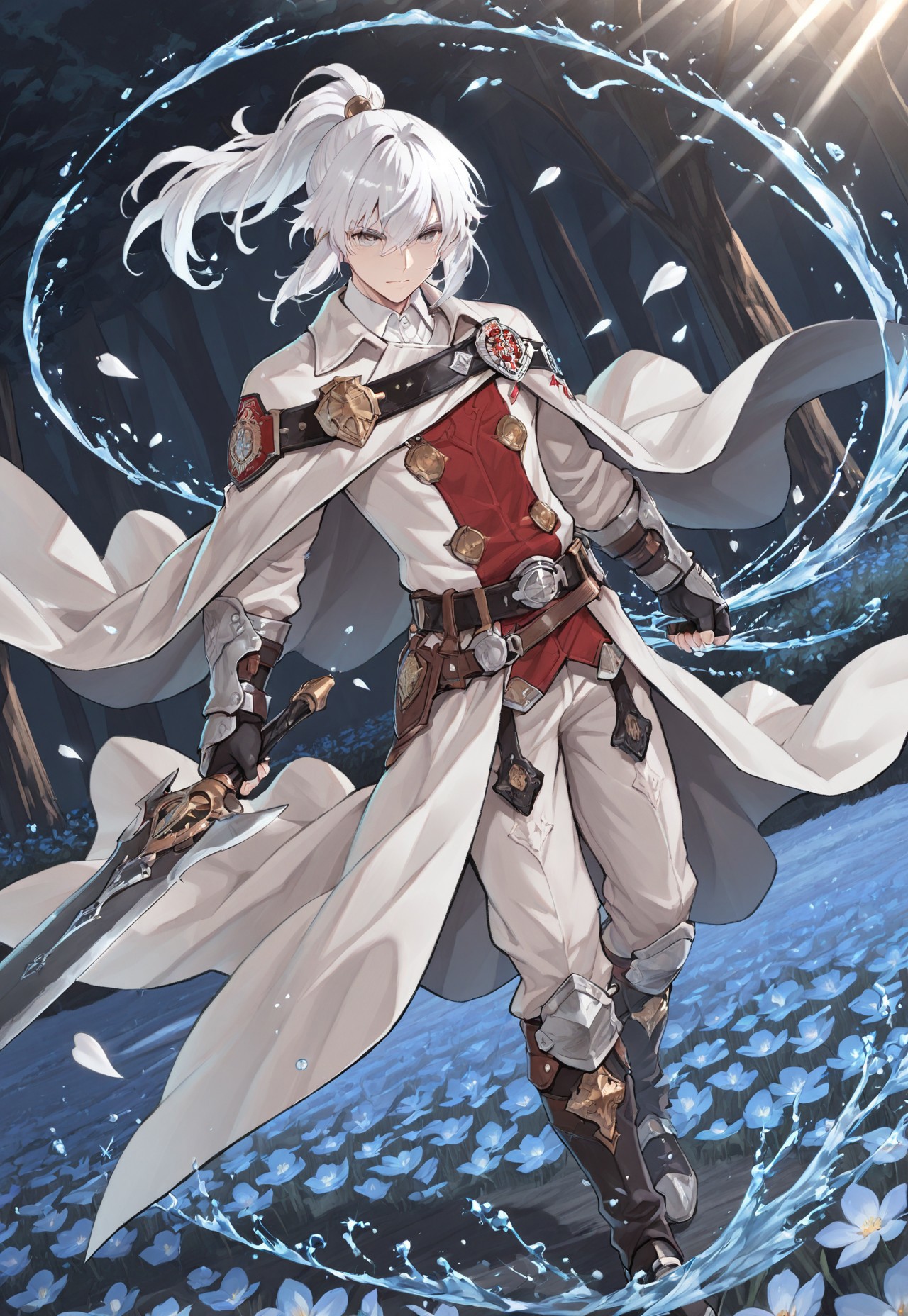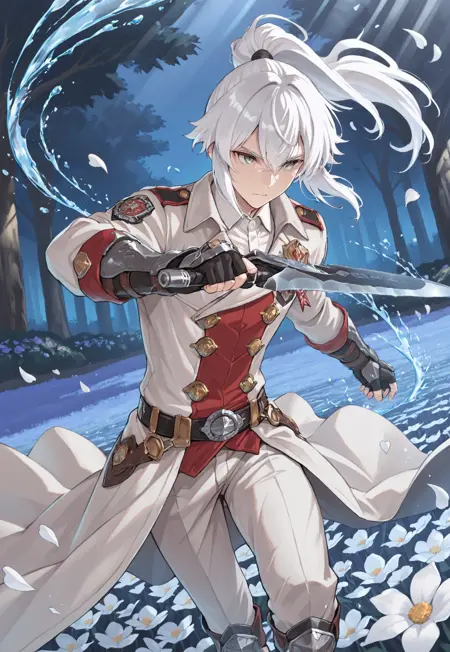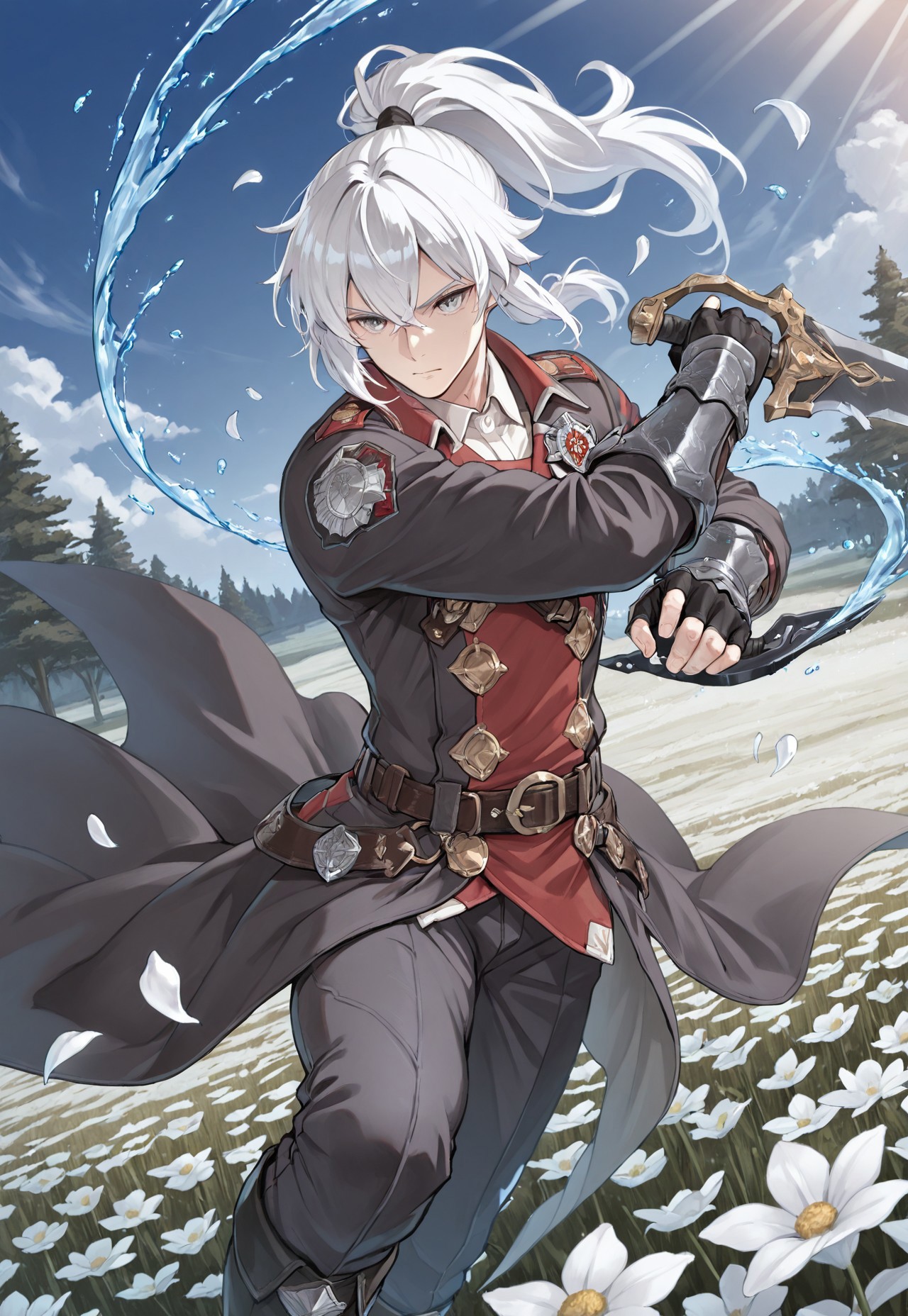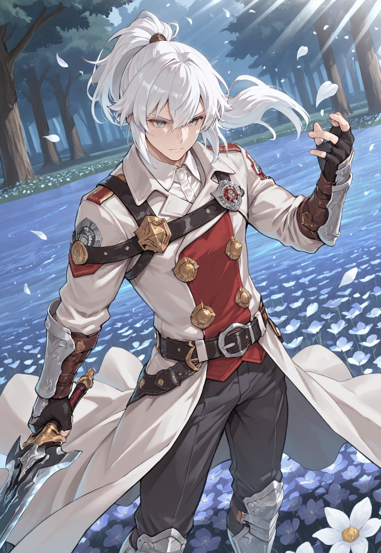 belt, emblem, cape, coat, collared shirt, fingerless gloves, pants, boots, armored gloves