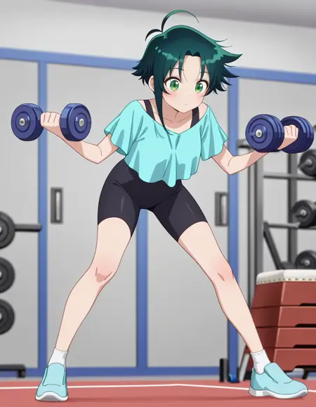 workout outfit, off shoulder, black unitard, aqua top, short sleeves, white socks, aqua footwear