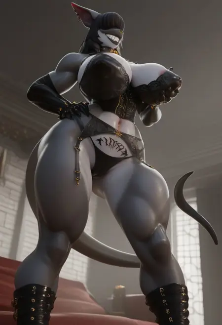 piercing, tail, colored skin, furry, animal ears, nipple piercing, muscular female, large breasts, grey skin, black hair, sharp teeth, tattoo