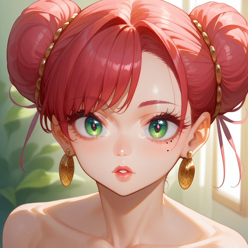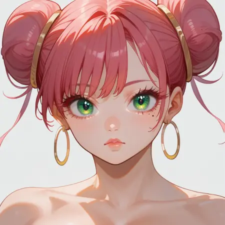 1girl, jewelry, earrings, double bun, green eyes, pink hair, mole under eye,