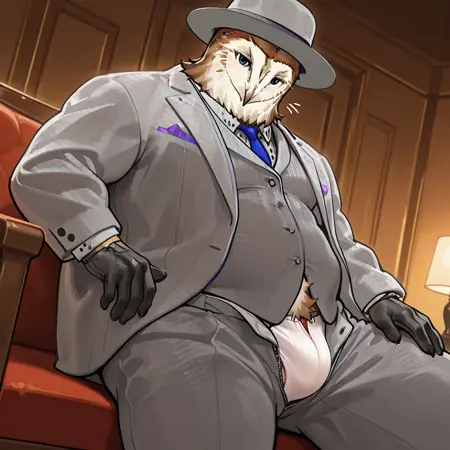 클래식한 옷차림: 검은 장갑, 파란 넥타이, 회색 바지, 회색 정장 재킷, 회색 모자, 신발, 칼라 셔츠, 지팡이 들고 있음,