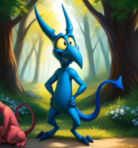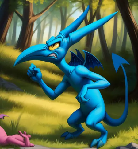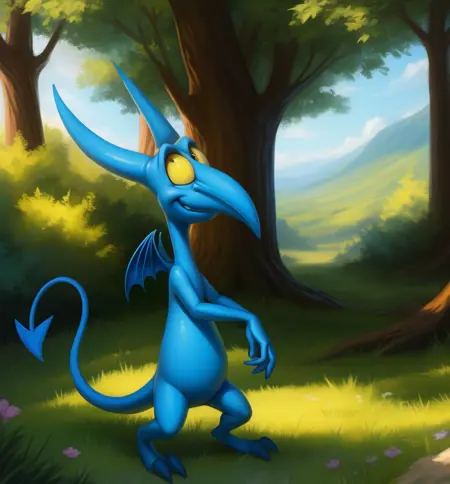 PanicImpHerc1, imp, light blue skin, claws, small wings, yellow sclera, ( pointed tail, chibi, male, boy,)
