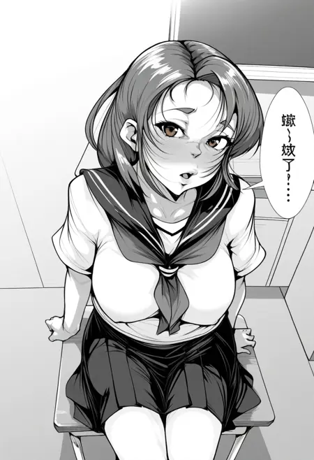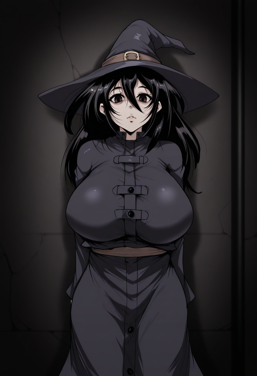 1girl, young woman, girl, black hair, long hair, thick hair, huge breast, dark eyes,