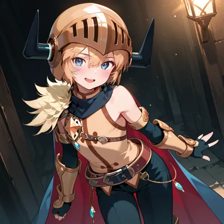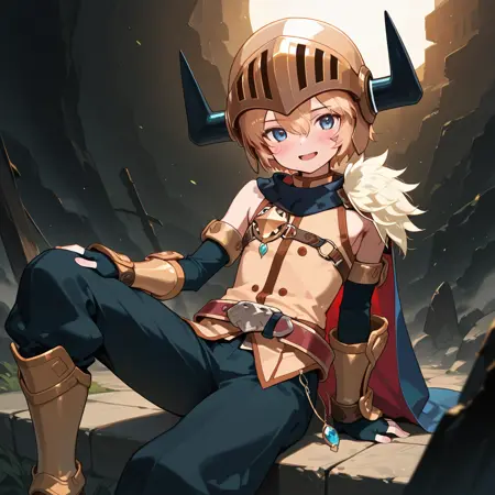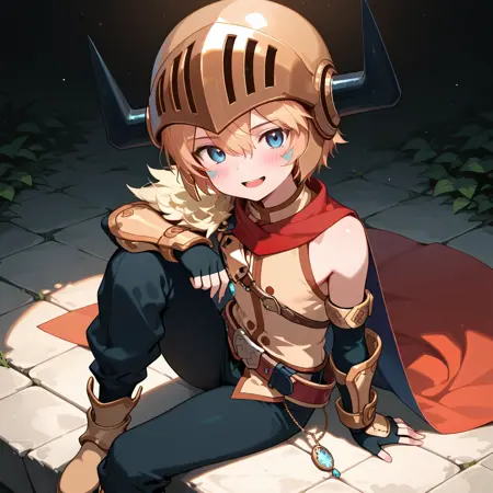 kai, 솔로, 뺨이 붉음, 미소, 단발, 입을 벌림, 파란 눈, 금발, 1소년, 눈 사이의 머리카락, 남성 초점, 부츠, 소매 없음, 검은 장갑, 벨트, 바지, 손가락 없는 장갑, 망토, 갑옷, 털 장식, 헬멧, 뿔 모양 머리장식, 얼굴 무늬,