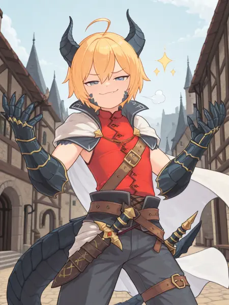 girgas,蓝眼睛,金发,龙角,短发,斗篷,白色斗篷,龙尾,呆毛,鳞片,裤子,红衬衫,无袖,护腕,爪子,