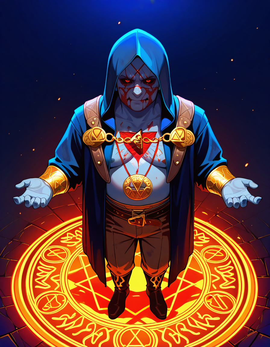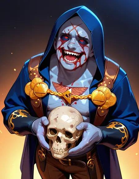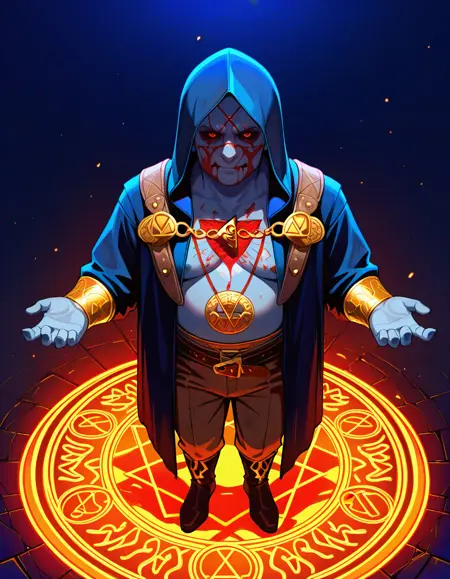 BalthazarBG3, Gray Skin, Hooded, Black Robe, Golden Jewelry, Leather Pants, Leather Boots, Belt, Shirtless, Bloody face, Scarred face, red eyes, tattoo, animal bones, 1boy