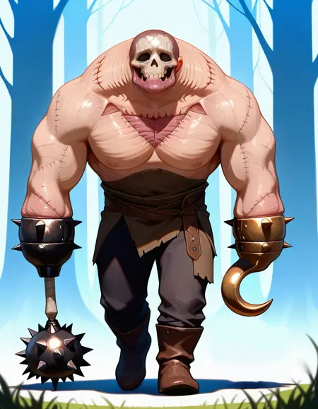 FleshBG3, huge, monster, shirtless, stitches, Brown Cloth, weapon arm, spiked mace, hook hand, rotten skin, fullbody