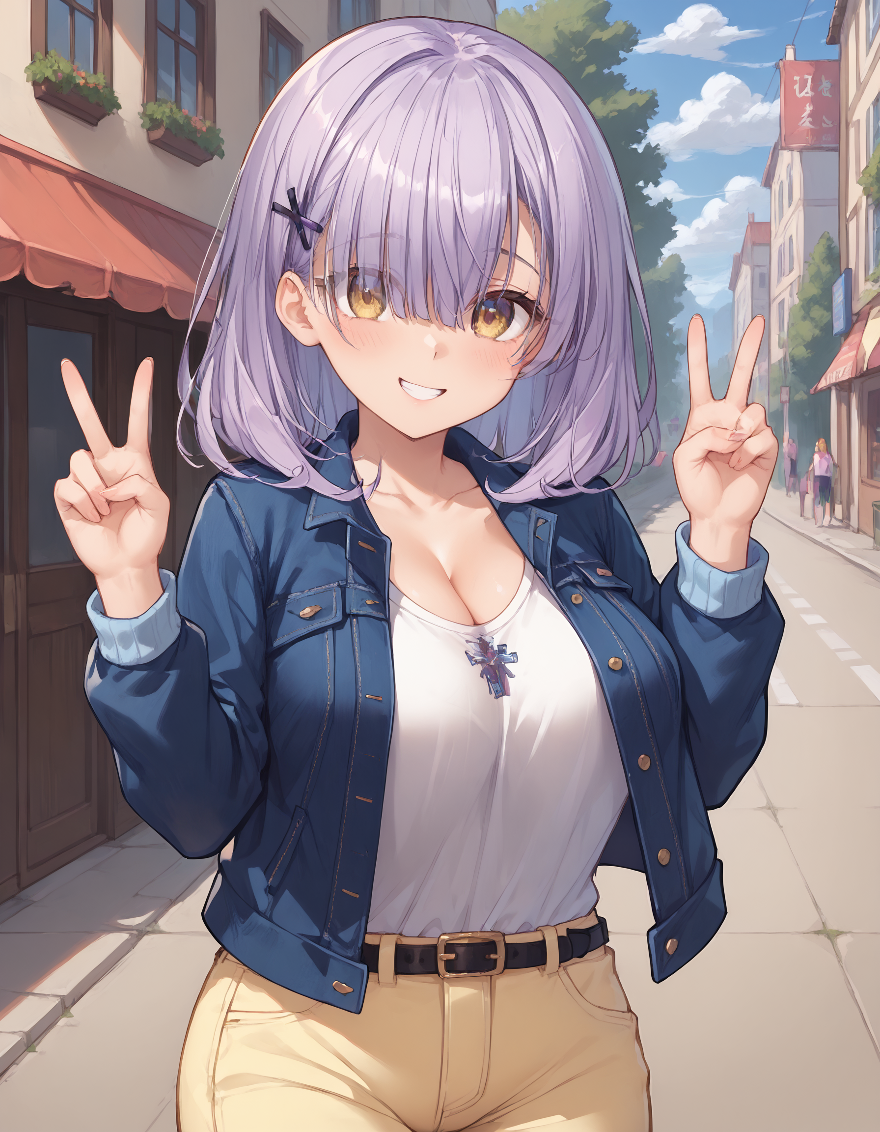 服装01,夹克,牛仔夹克,长袖,卷起袖子,T恤,白衬衫,衬衫塞进裤子,锁骨,胸部,腰带,黑色腰带,裤子,黄色裤子,露脚踝,鞋子,米色鞋子,配饰,