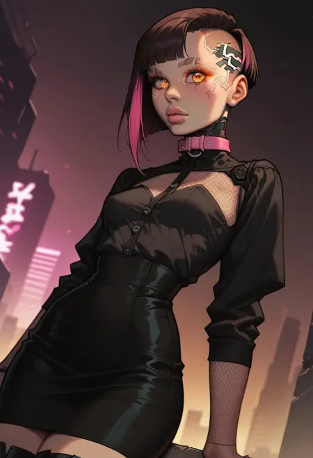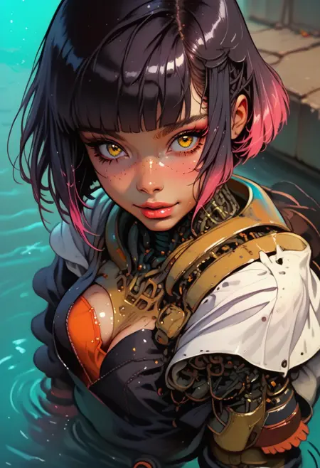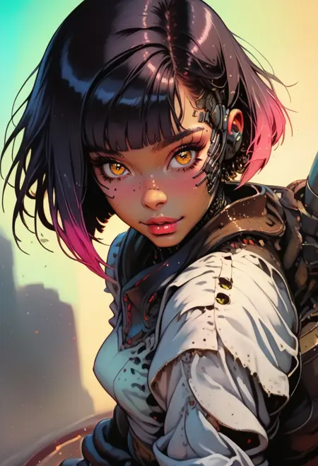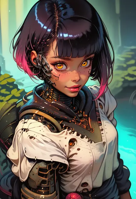 (琥珀色の瞳、詳細な濃い虹彩、詳細な髪の毛の一本一本、色付きハイライトが入った黒髪、ネオンハイライト、完璧で自然な唇、ツヤのある唇、丸くてかわいい顔)