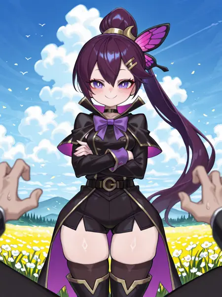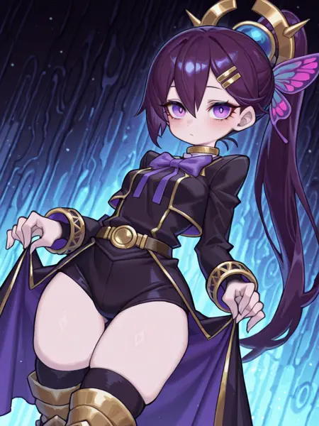 Alice_BF, purple eyes, dark purple hair, butterfly hairclip, hair ornament, ponytail