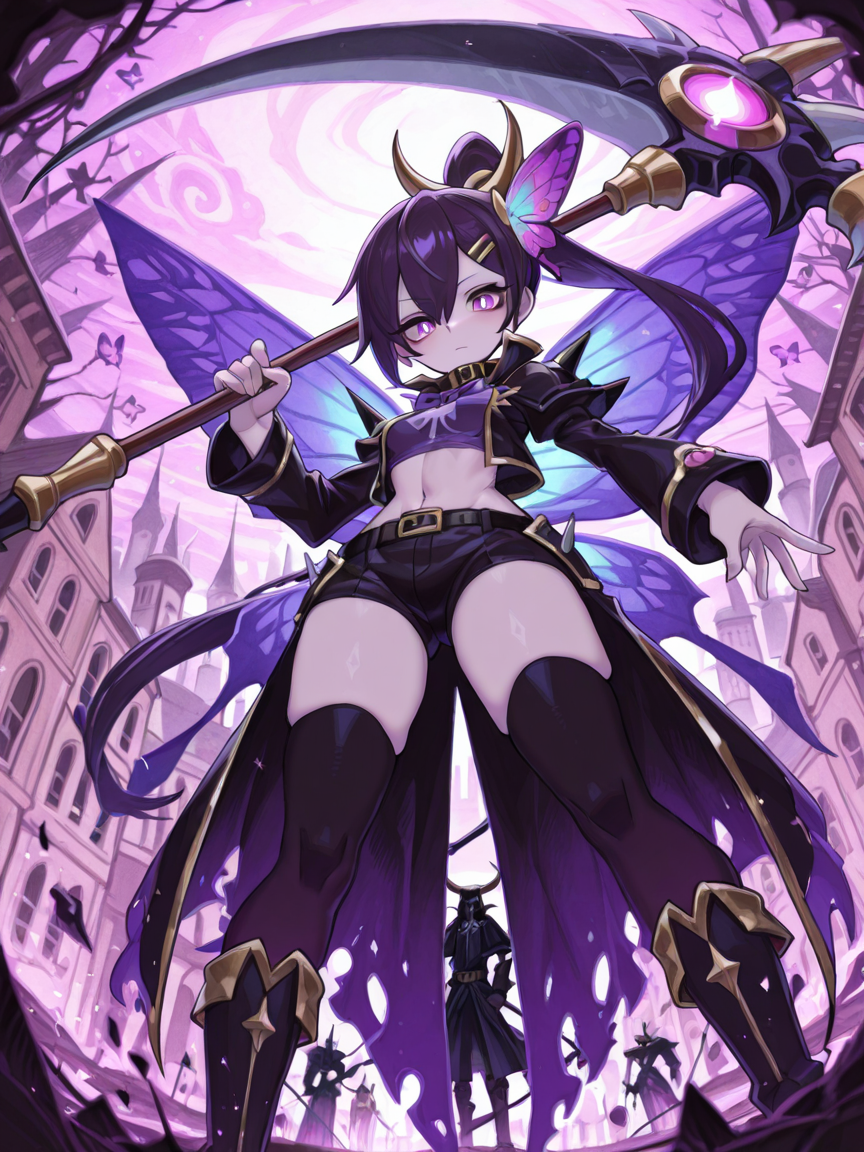 Evo Outfit: butterfly wings, midriff, spikes, armor, gold trim, boots, collar, black jacket, belt, shorts, dark blue crystals, jewelry, thighhighs, buttcape