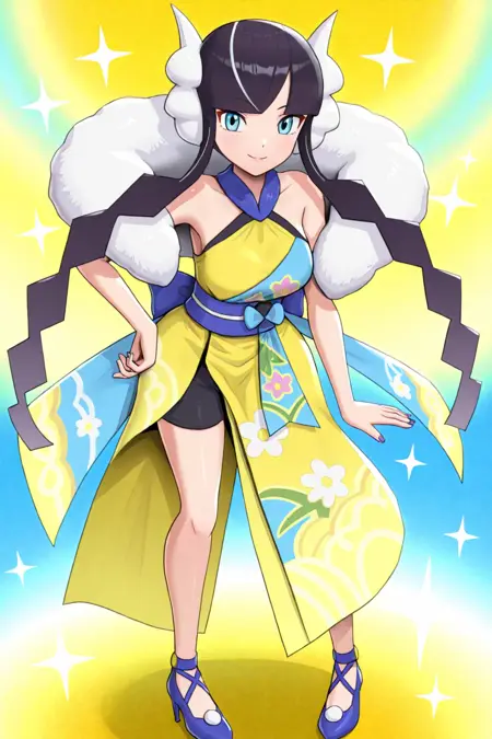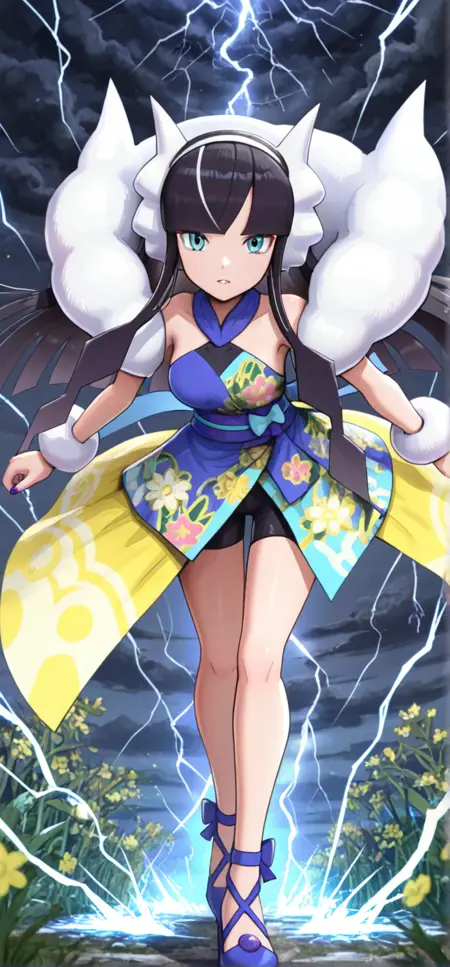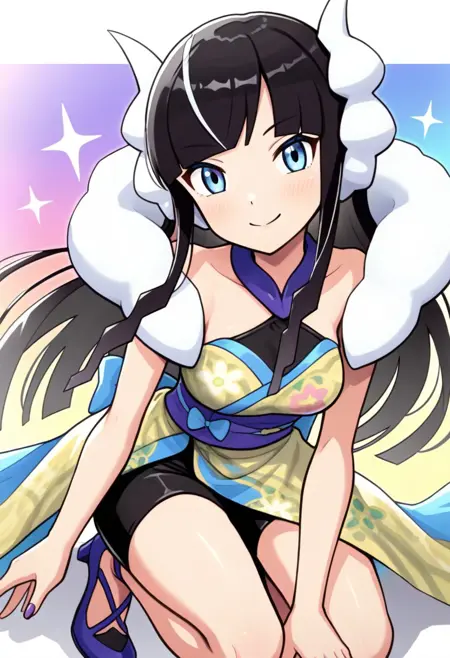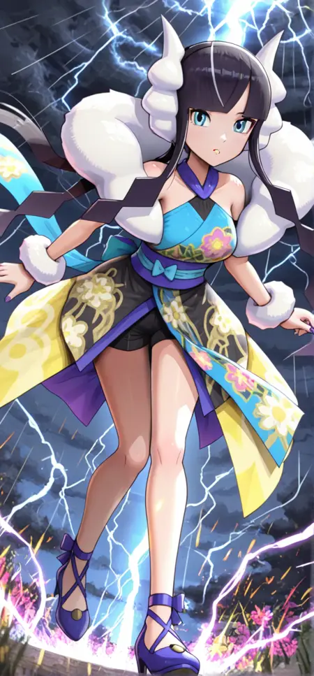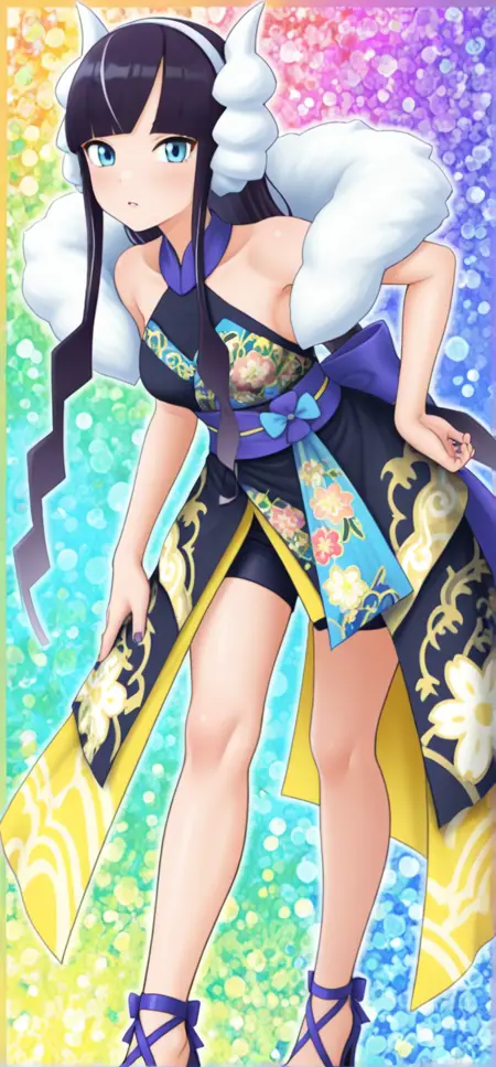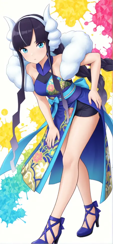 ssaelesa, blue eyes, long hair, black hair, multicolored hair, sidelocks, headphones, fur collar, halter dress, sleeveless, bare shoulders, black shorts, japanese clothes, blue sash, purple nails, high heels, blue footwear