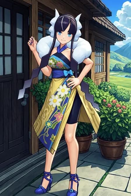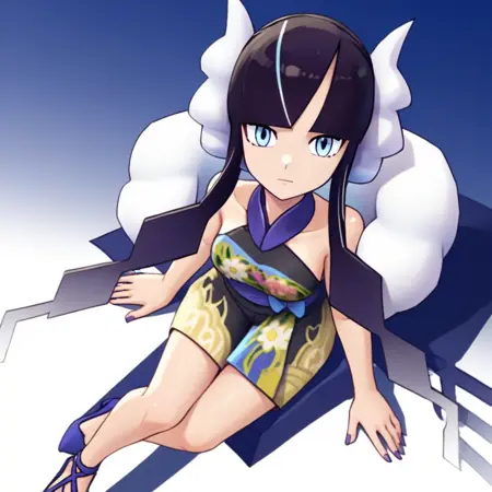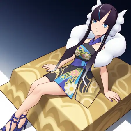 ssaelesa, blue eyes, long hair, black hair, multicolored hair, sidelocks, headphones, fur collar, halter dress, sleeveless, bare shoulders, black shorts, japanese clothes, blue sash, purple nails, high heels, blue footwear