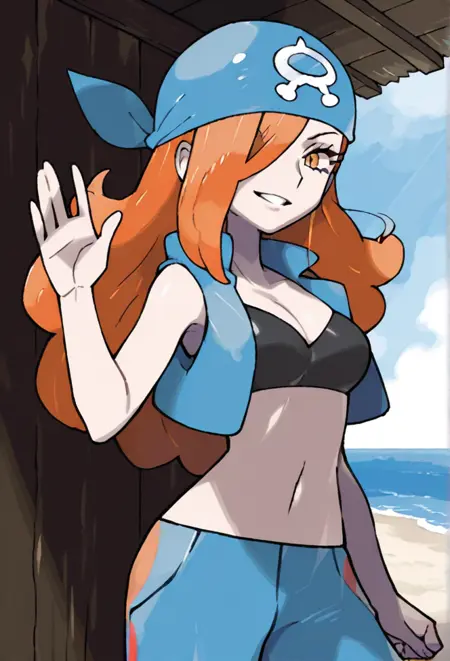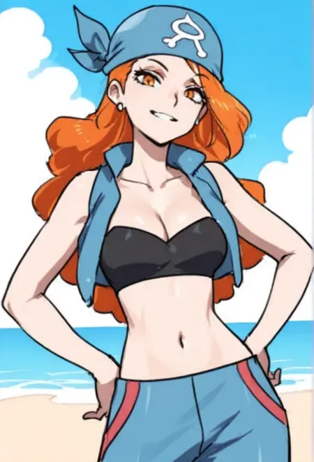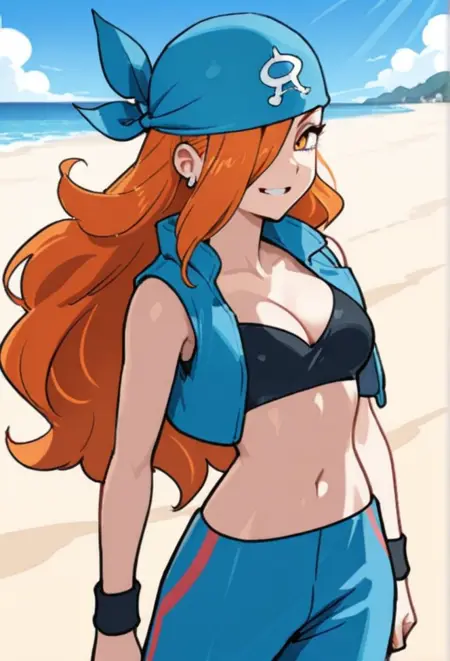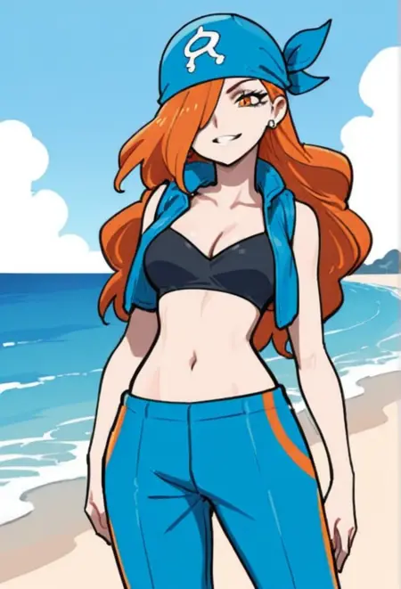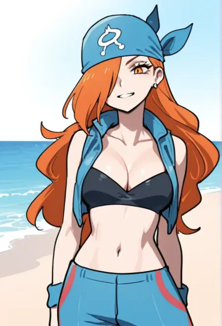 1girl, shellyrse, 橙色头发,长发,头巾,背心,敞开的背心,乳房,腰部,肚脐,短上衣,乳沟,裤子,长发,橙色头发,头发遮住一只眼睛,