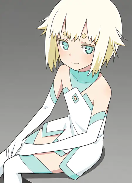 1girl, solo, aqua eyes, blonde hair, short hair, clothes, dress, bare shoulders, elbow gloves, panties, thighhighs, flat chest,