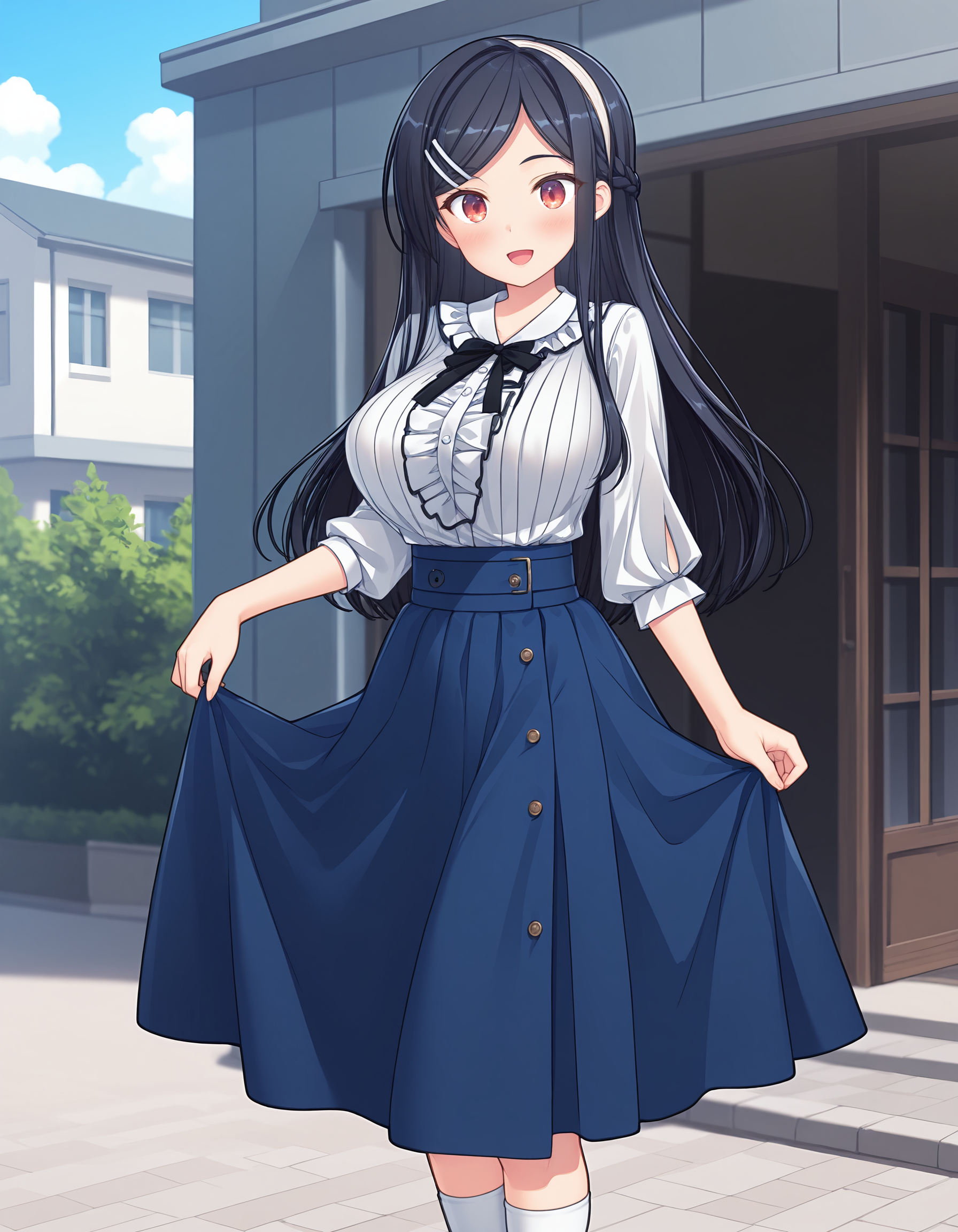 outfit02、ブラウス、白いブラウス、フリル付きブラウス、ハーフスリーブ、リボン、黒いリボン、スカート、濃紺のスカート、スカートのボタン、ロングスカート、靴下、白い靴下、靴、黒い靴、