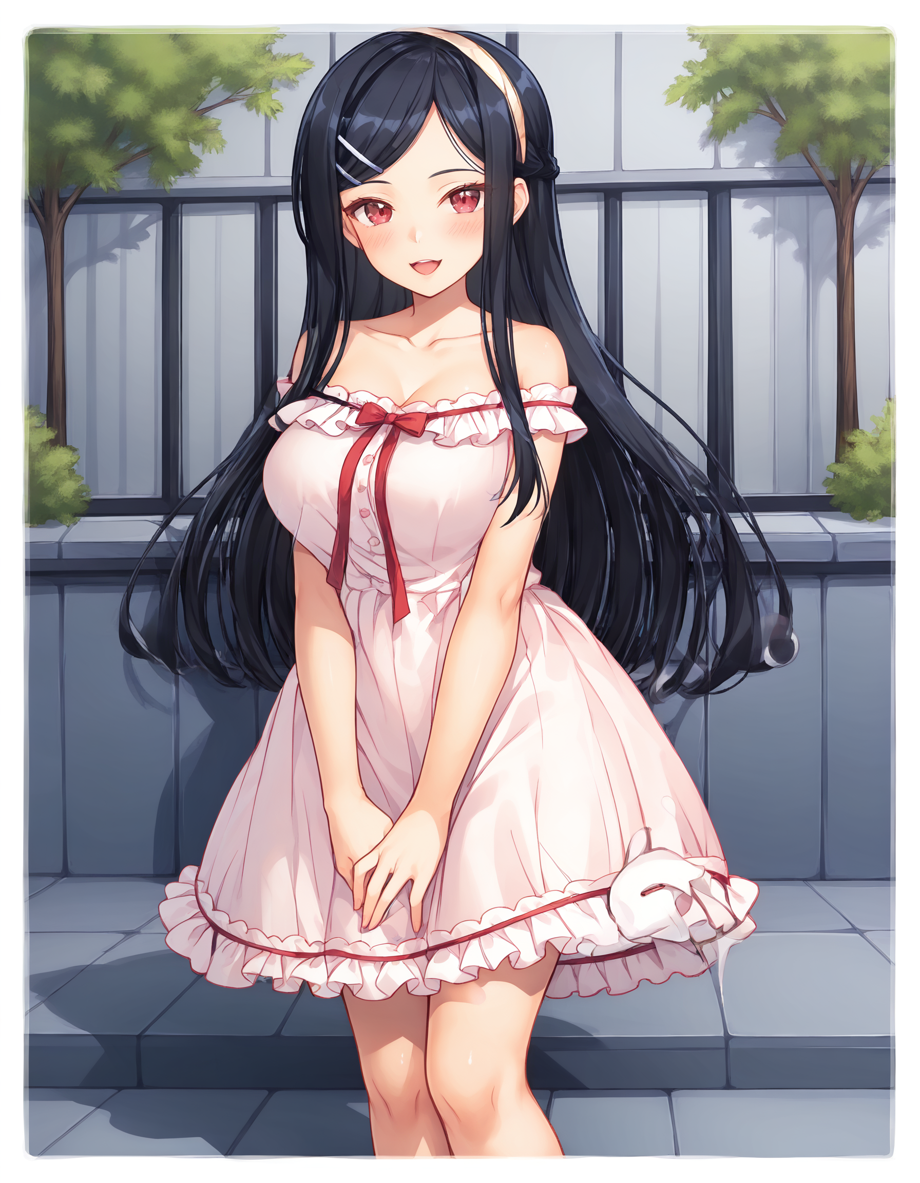 outfit03,连衣裙,粉色连衣裙,露肩连衣裙,锁骨,裸肩,荷叶边连衣裙,蝴蝶结,红色蝴蝶结,无袖。