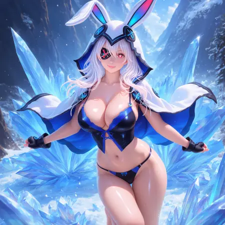 Gamchicoth、赤い目、フード、アイパッチ、白髪、ウサギフード、動物フード、素足、へそ、下着、手袋、長い髪、パンツ、ウサギの耳、髪の色の変更、フィンガーレスグローブ、動物の耳、腹見せ