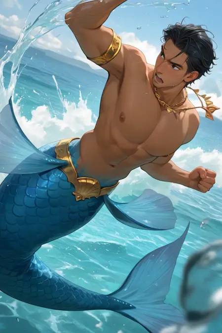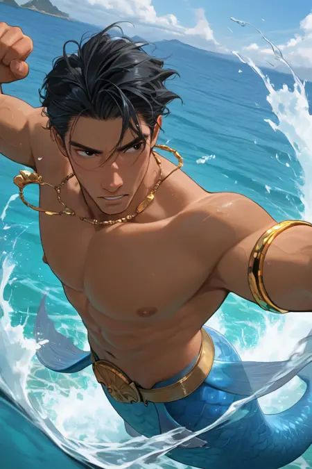 shirtless, nipples, merman, blue scales, fins, gold necklace, ornate gold belt, gold armband,