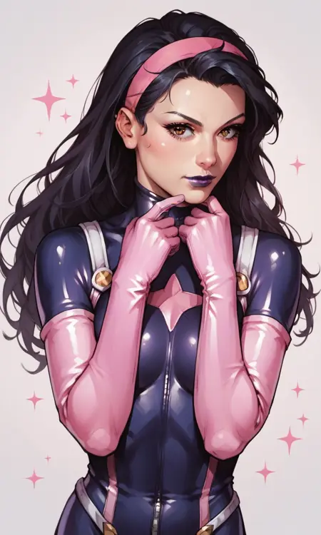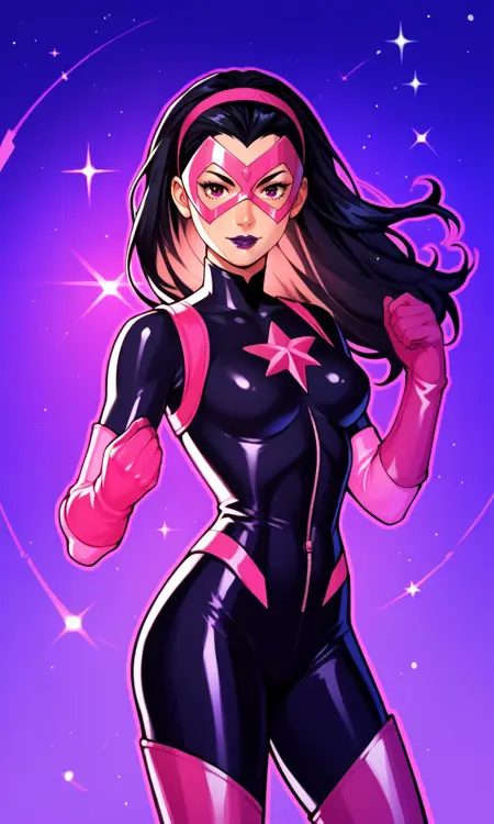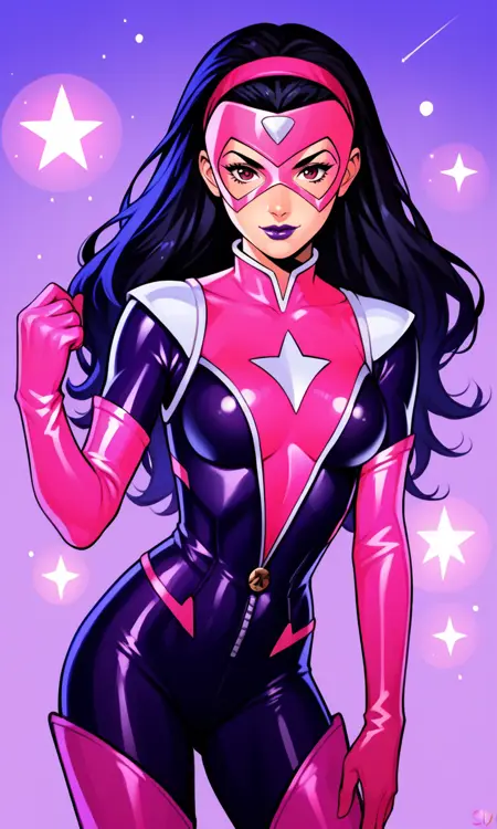 1girl,star sapphire(dc),long hair,black hair,pink headband,mask,brown eyes,purple lips,two-tone bodysuit,black bodysuit,pink bodysuit,elbow pink gloves