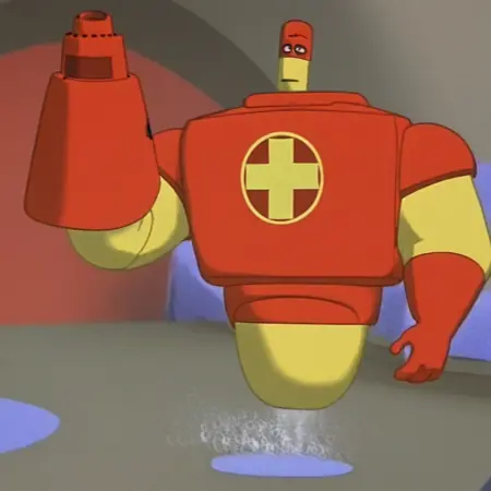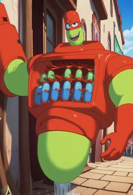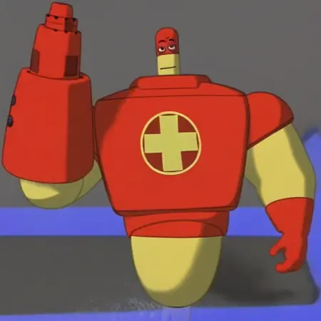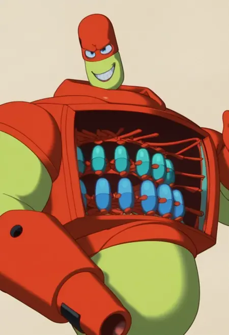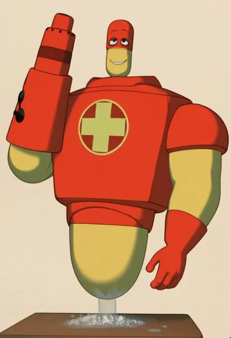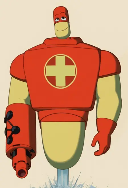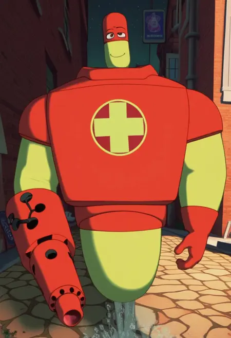 Prompt: drix, robot, male, solo, pill shape face, red and yellow body armor, yellow cross logo on armor chest, muscular, right arm cannon, red left hand, no legs, effervescent propulsion, full body