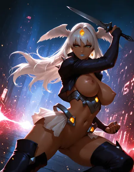 white hair, long hair, blue lips, dark-skinned female, green eyes,