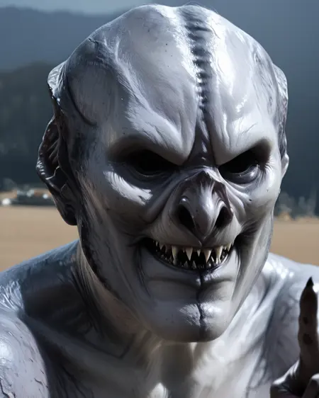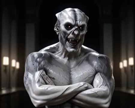 pale gray skin, no human, vampire, black sclera, pointed nose, elongated eardrums,sunken eyes,large ears, smooth, textured skin,sharp teeth, hairless head,deep wrinkles, man bat, creature,