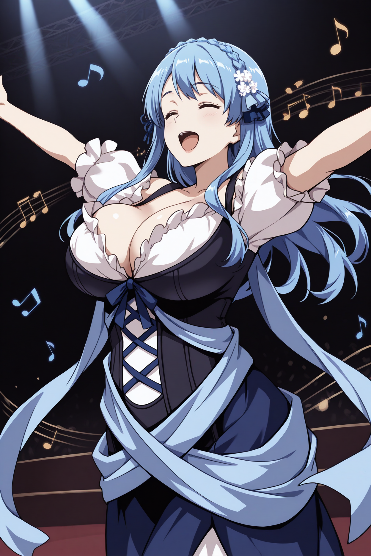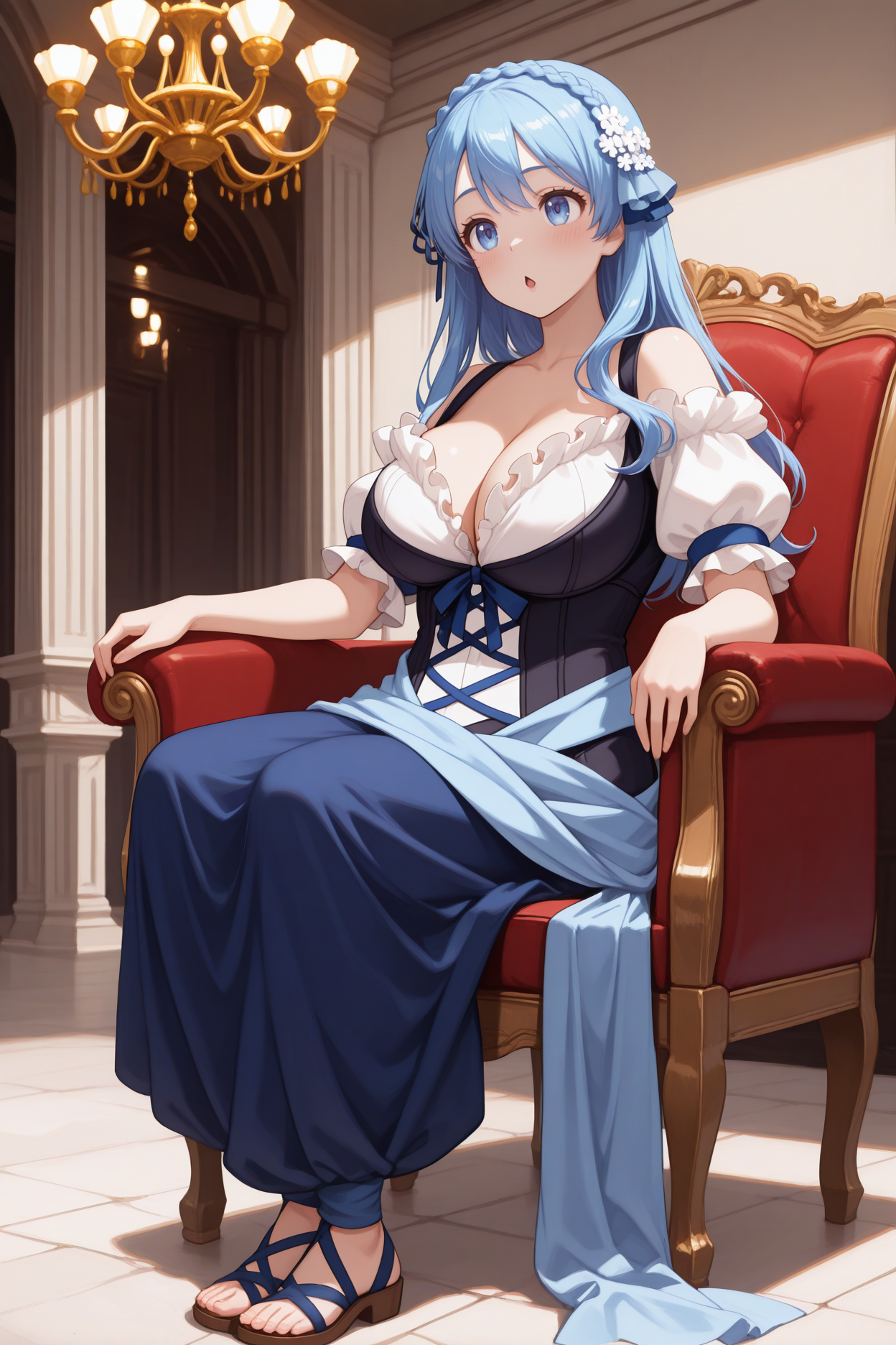 Add "hair ribbon, hair ornament, hair flower, puffy short sleeves, frilled dress, dark blue dress, dirndl, light blue sash, sandals" for her typical look.