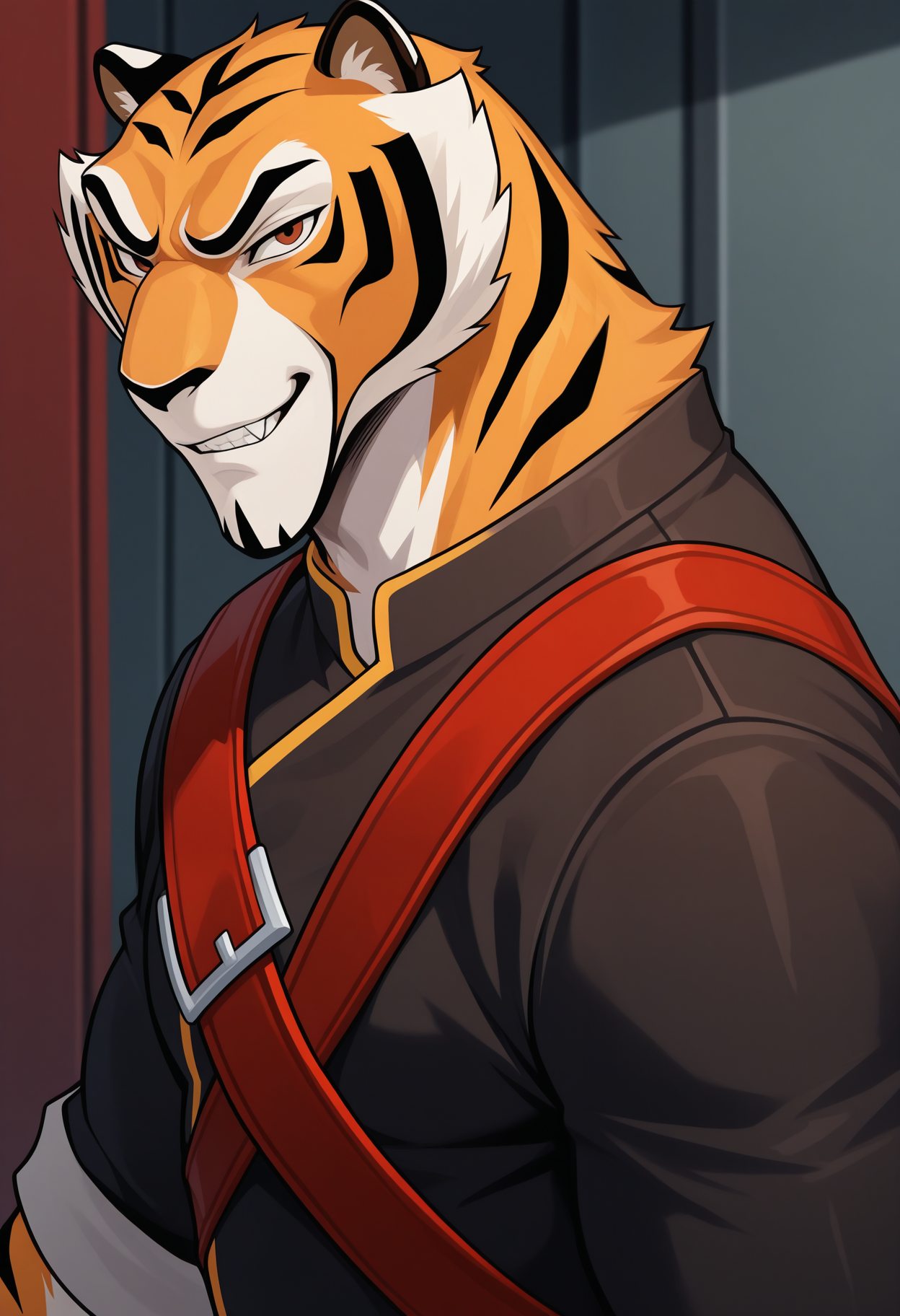 주요 옷차림: 검정 정장, 빨간 가슴 하네스, 갈색 벨트, 빨간 벨트 가슴 하네스,