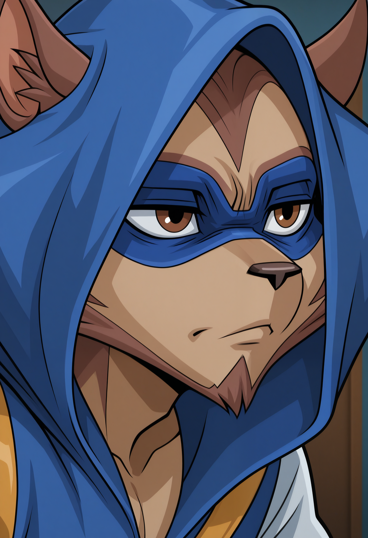 メイン衣装: 青いアイマスク、トップノット、ジャンプスーツ、青いズボン、濃紺のフィットした靴、V1ベルト、腕甲、ロープ式胸ストラップ、尾、リオチの杖、