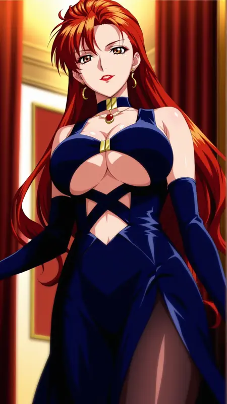 服装:珠宝,新月耳环,口红,露乳,下胸围,项圈,妆容,丝袜,肘部手套,项链,连衣裙,红色高跟鞋,