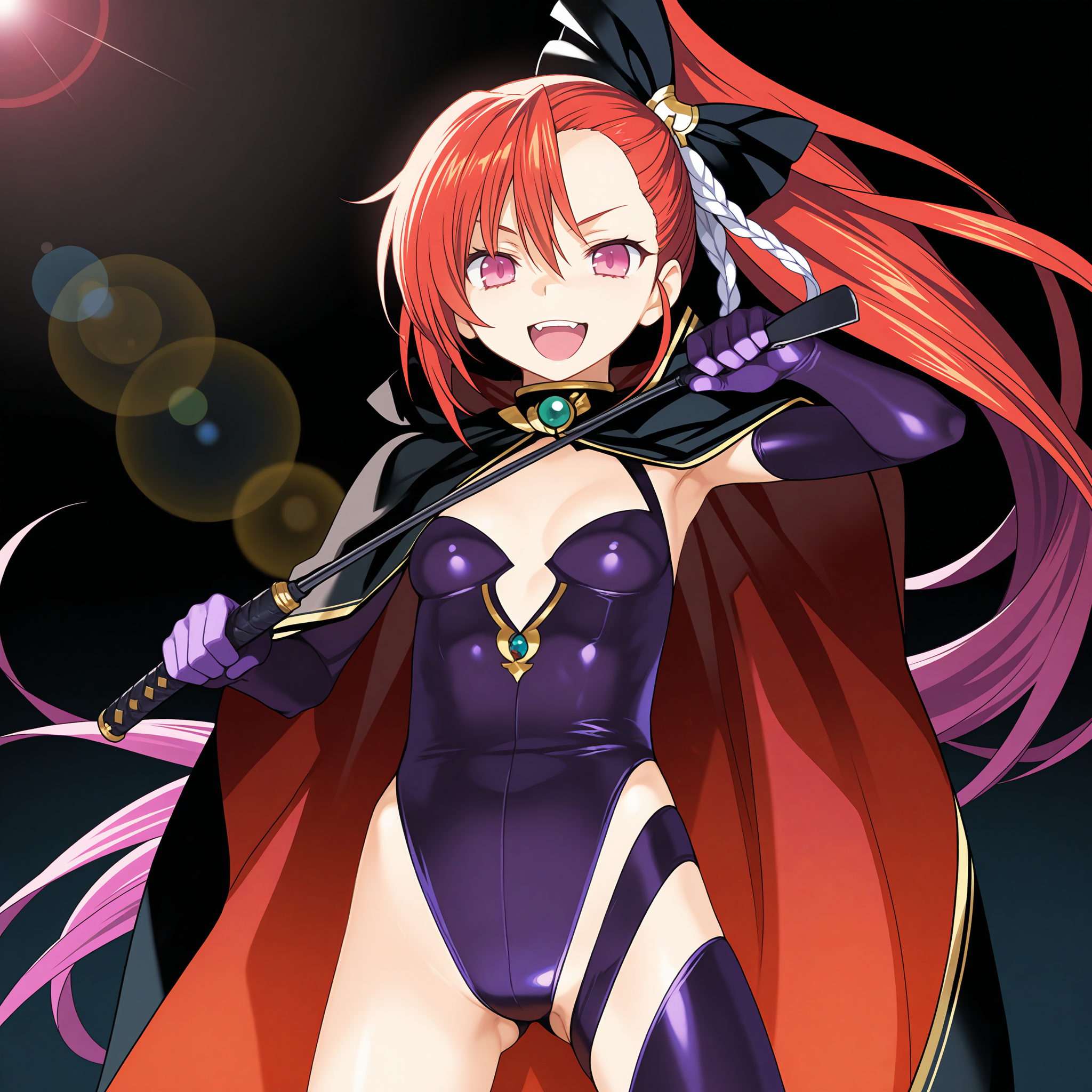 공식 복장, 사이드 토끼 꼬리, 흰색 땋은 머리, 머리 리본, 머리 장식, 자주색 장갑, 팔꿈치 장갑, 보석, 검은 망토, 자주색 레오타드, 자주색 허벅지 양말, 불균형한 하의, 검은 리본, 빨간 안감,