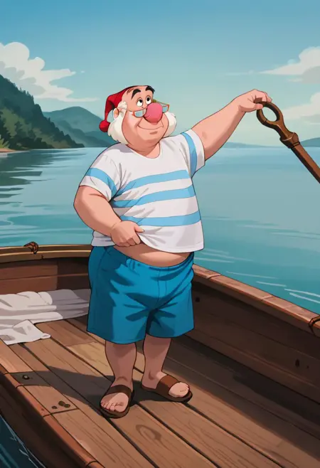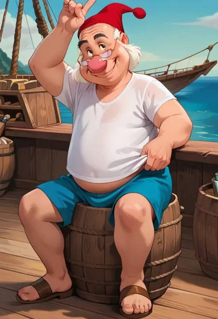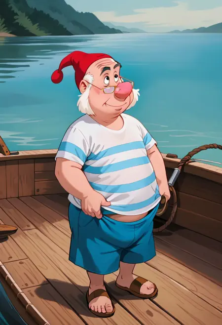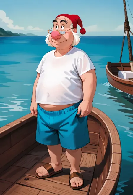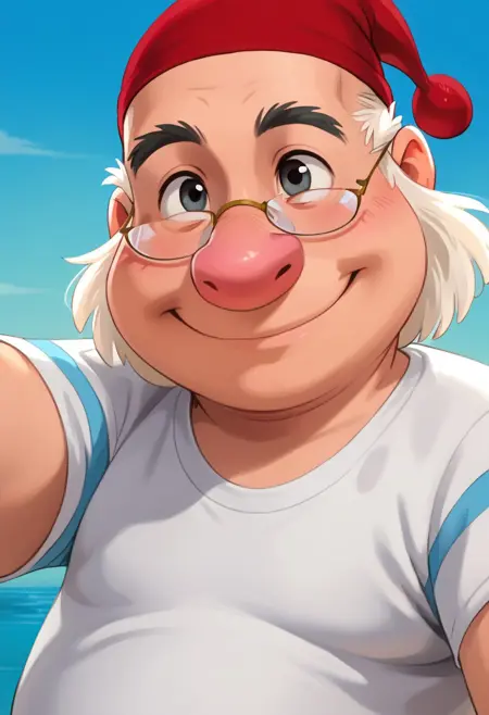 1boy, male, human, man, elder, mature, chubby, short height, white hair, thick, black eyebrows, black eyes, big nose, pink nose, brown sandals, short-sleeved shirt, stripped shirt, blue shorts, half-moon glasses and, red stocking cap