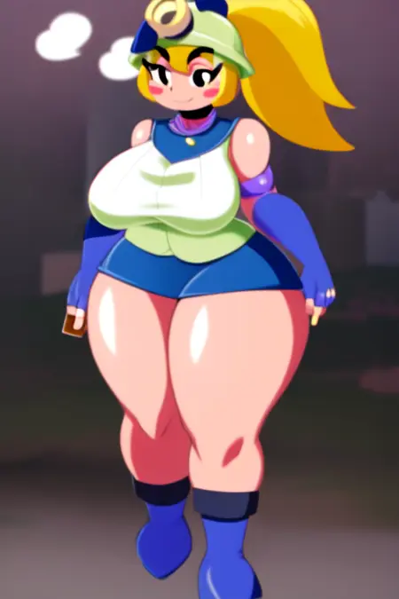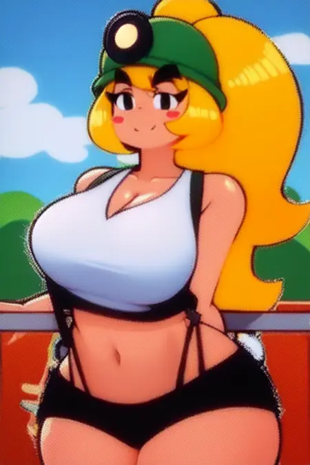 激活标签是goombella,默认权重下应该能正常工作,当然也可以自行调整。头盔、上衣和短裤通常能还原她的服装。牙齿部分有点乱,如果面部生成异常,可以去掉她标签中的“fang”。