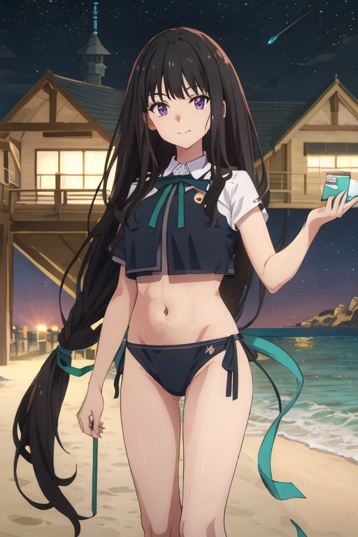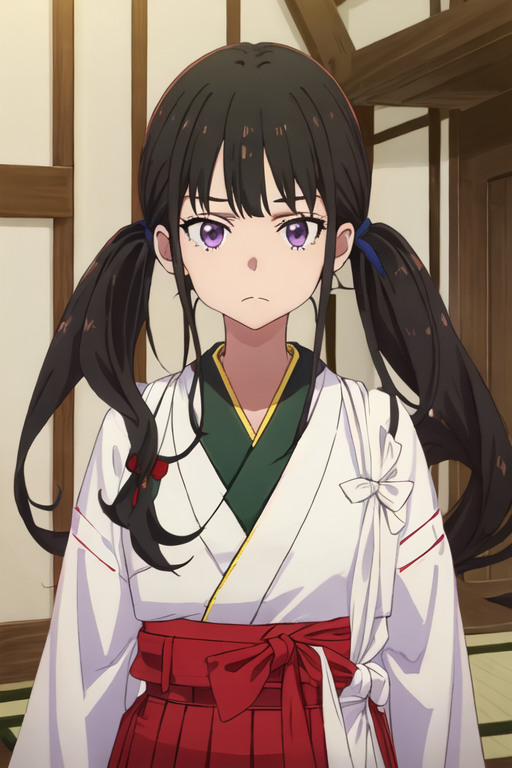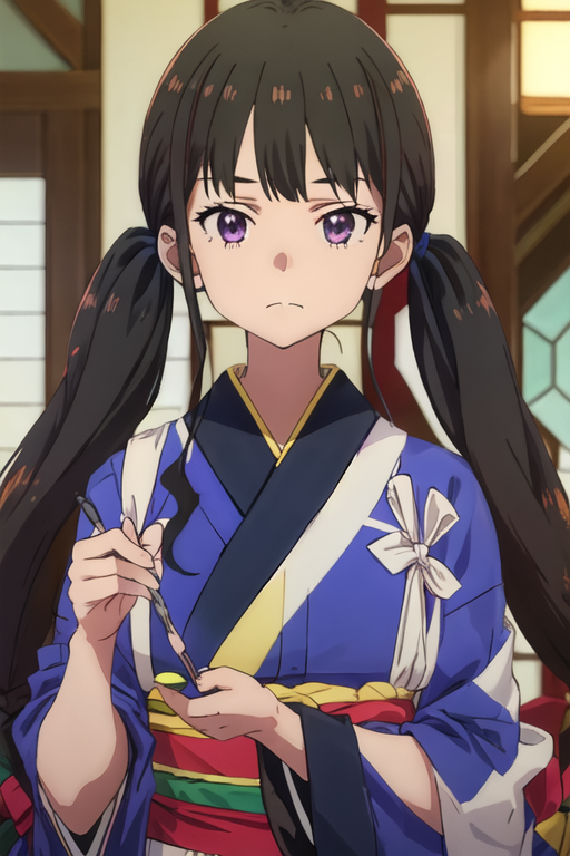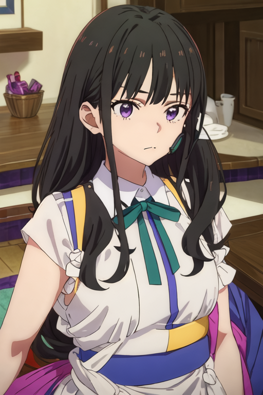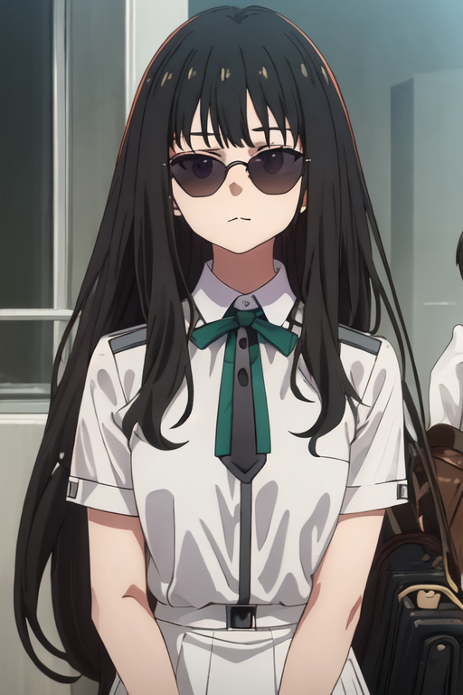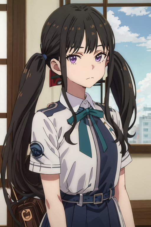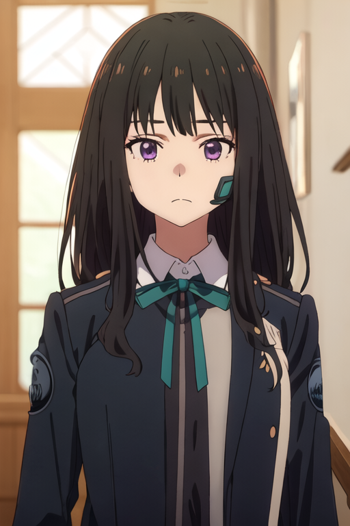 The trigger word is inoue_takina_lycorisrecoil, and the recommended tags are best quality, masterpiece, highres, solo, {inoue_takina_lycorisrecoil:1.15}, black_hair, long_hair, bangs, purple_eyes, closed_mouth, ribbon, green_ribbon, neck_ribbon.